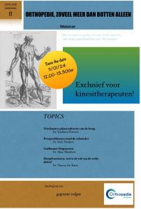 11/01/24 12:00-13:30 SAVE THE DATE!do 11.01.202412u-13u30 Enkele weken geleden ging het OCT-congres van AZTurnhout door. Om organisatorische redenen was het onmogelijk om de kinesitherapeuten hiervoor uit te nodigen.Op vraag van Kinekring Noorderkempen organiseert de dienst orthopedie op 11 januari 2024 een zeer interessant (lunch)webinar. U vindt het programma op de flyer in bijlage. Uiteraard hopen… Lees meer: Orthopedie, zoveel meer dan botten alleen - Huidige inzichten in fysiologie en behandelingsstrategieën van PIJN en implicaties voor de kinesitherapeut.